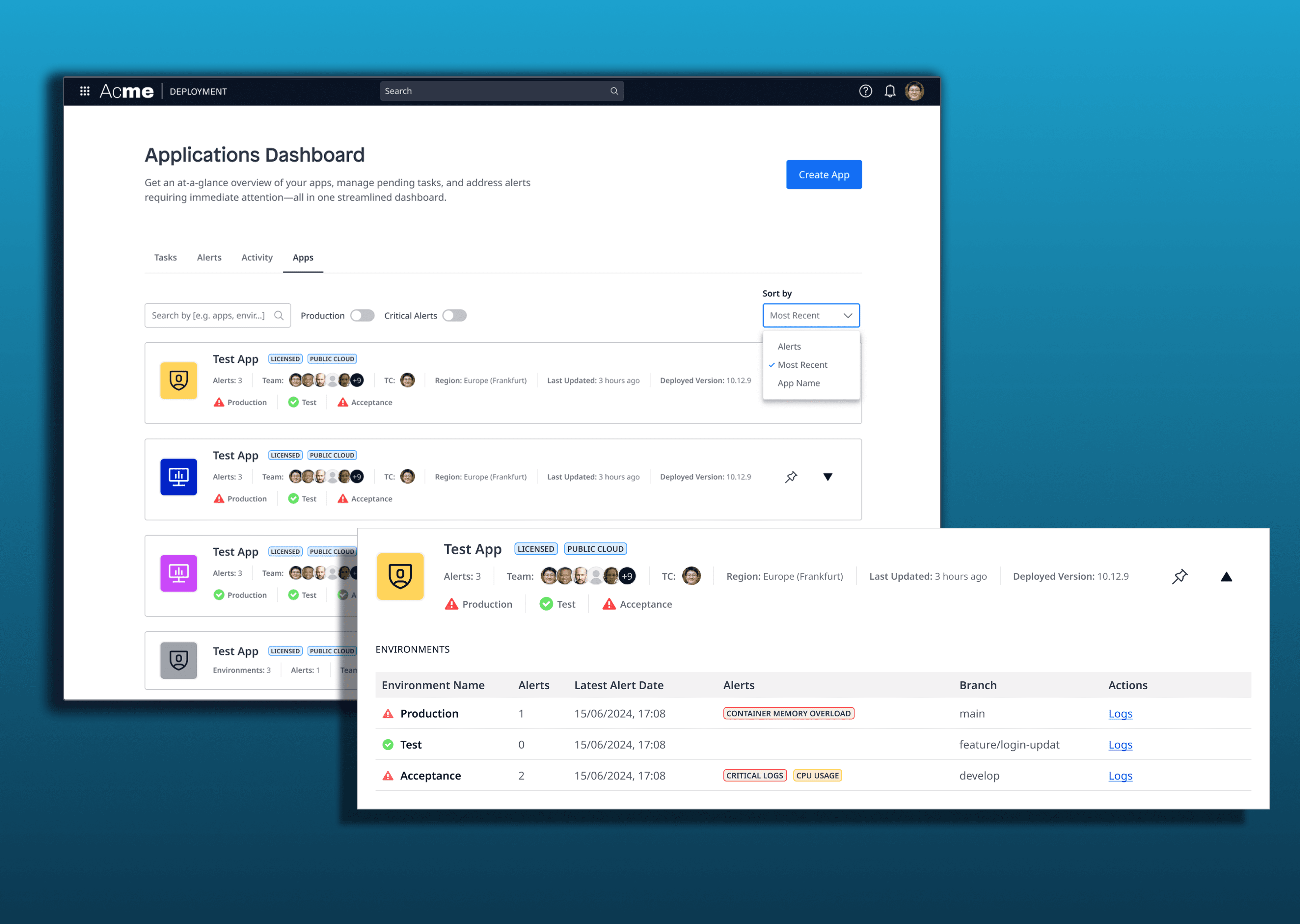 Design started with multiple concepts and wireframes exploring different ways to structure information density without overwhelming users. Early iterations tested split layouts and aggregated overviews, which revealed confusion around hierarchy and relationships between apps, environments, and alerts. Through several rounds of usability testing (both internal and external) the design gradually shifted toward a tab-based structure, separating Apps, Alerts, Tasks, and Activity logs. This reduced cognitive load, improved findability, and aligned better with users’ mental models. Each iteration refined what information belonged where, ultimately resulting in a clearer, more scalable dashboard that adapts to both small and large app landscapes.