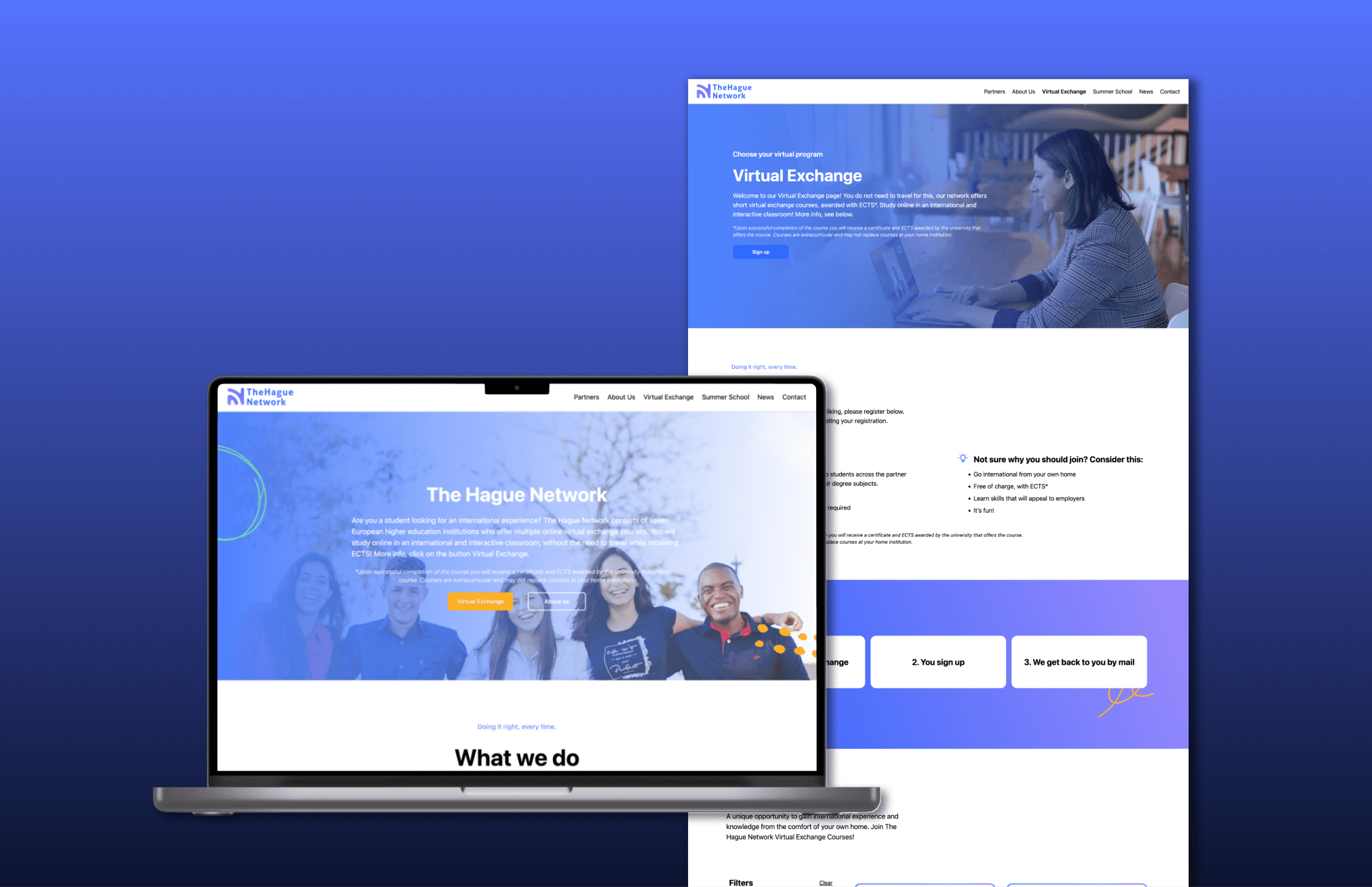 The challenge in this project was primarily to revive the outdated website design and visual identity of The Hague Network. The main task was to highlight the opportunities provided for students while also portraying the organisation's diverse activities and creating a unified website where each partnering university could participate.
